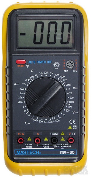 Цифровой мультиметр Mastech MY-63 измеряет величины силы постоянного и переменного тока, постоянного и переменного напряжения, сопротивления, коэффициента усиления биполярных транзисторов, емкость конденсаторов и частоту синусоидального сигнала в звуковом диапазоне. Высокое входное сопротивление не вносит погрешности при измерениях величин и говорит о высокой точности прибора. В приборе применен АЦП с измерением значений методом двойного интегрирования. Выбор пределов измерения величин производится вручную путем установки нужного положения многопозиционного переключателя.