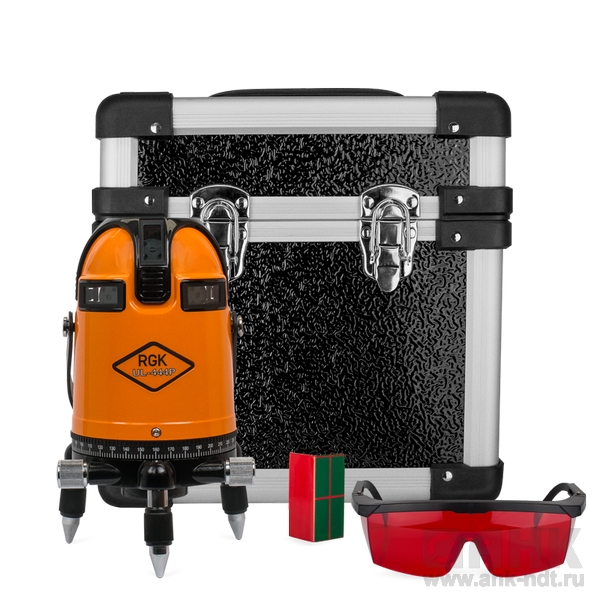 Стандартная комплектация: Лазерный нивелир RGK UL-444P, ударопрочный футляр - кейс, очки для работы с лазерными приборами, элементы питания, инструкция на русском языке.