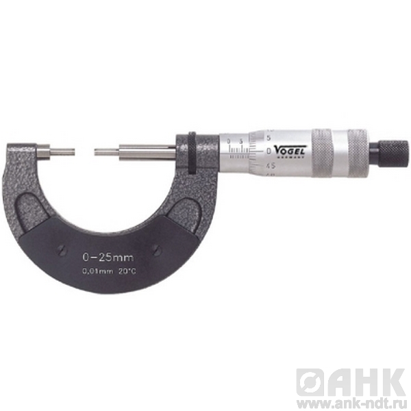 Микрометры Vogel гладкие со ступенчатыми колками прецизионные диапазон измерений от 0-25х0,01 мм до 175-200х0,01 мм, длина ступени 10 мм, качество Silver-Line, предназначены для высокоточного определения линейных размеров. Измерение производится абсолютным или относительным контактным способом. Основным преимуществом инструмента является низкая погрешность, которая колеблется в промежутке значений от 2 до 50 мкм и зависит от класса точности микрометра, а также от измеряемого диапазона. В качестве преобразовательного механизма выступает так называемая микропара – винт и гайка.