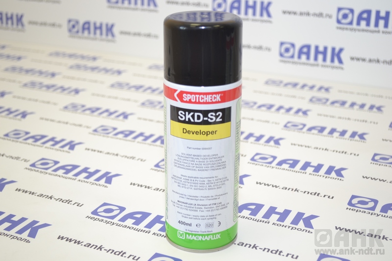 Белый суспензионный проявитель Spotcheсk SKD-S2 представляет собой белый сорбент, диспергированный в быстросохнущих растворителях и поглощающий индикаторный пенетрант. Проявитель SKD-S2 имеет слабый спиртовой запах, коррозионно не активен. SKD-S2 образует матовое белое покрытие, которое обеспечивает отличный контрастный фон для индикаторных рисунков пенетрантов MAGNAFLUX серий SрotcheckTM и ZygloTM. Обеспечивает повышенную чувствительность за счет растворяющего воздействия на пенетрант в месте расположения дефекта.