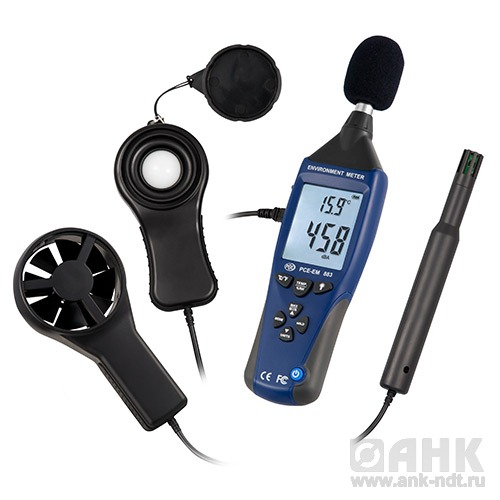 Комбинированный прибор PCE-EM 883 — многофункциональный прибор измерения параметров окружающей среды. Измерение температуры влажности, освещенности, скорости потока воздуха, уровня шума.