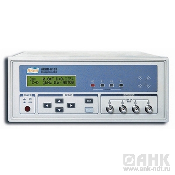 Измеритель параметров RLC - АКИП-6101 -диапазон индикации: 0,1 пФ - 10 мФ, 0,1 мкГн - 10 кГн, 0,1 мОм - 1 ГОм, Z/Q/D/фазовый сдвиг, тест-сигнал 100/120 Гц/1/1 кГц и 0,3 В, базовая погрешность 0,3%, компенсация параметров ХХ и КЗ, Дельта-измерения, режим сортировки компонентов.