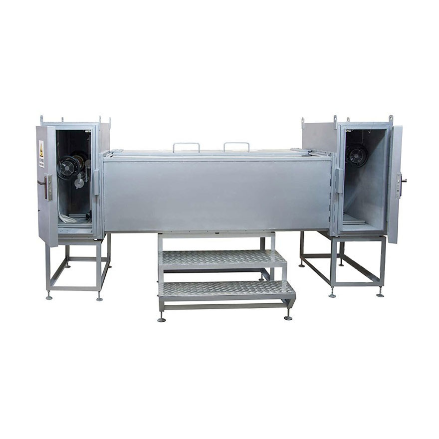 Защитная камера выполнена из стали и свинца, поставляется в разборном виде и монтируется на месте. Используется при промышленной дефектоскопии в стационарных условиях.