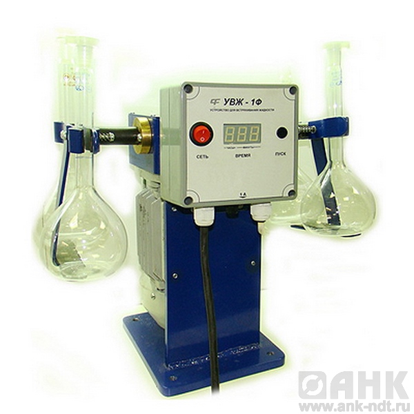 Устройство для встряхивания жидкостей в сосудах УВЖ-1Ф предназначено для испытания битумной эмульсии на устойчивость при транспортировании, в соответствии с ГОСТ Р 52128-2003. Сущность метода заключается в оценке способности эмульсии не распадаться на воду и вяжущее после испытания ее встряхиванием в  приборе в течение 2 ч. По истечении этого времени прибор автоматически прекращает работу. Во время работы на индикаторе отображается время, оставшееся до конца испытания.