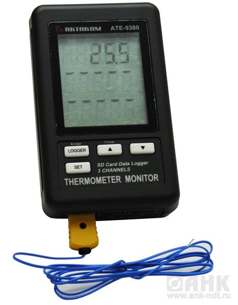 Измеритель-регистратор температуры АТЕ-9380 предназначен для измерения и регистрации температуры по 3-м каналам одновременно при помощи термопар K-типа.  Данный прибор совместно с преобразователем интерфейсов Актаком АСЕ-1025 и программным обеспечением AKTAKOM Data Logger Monitor или Aktakom ATE Easy Monitor на ПК реализует автоматизированные измерения температуры и разнообразную математическую обработку результатов измерений. В измерителе-регистраторе АТЕ-9380 имеется возможность сохранения измеренных данных на SD-карту в формате Excel в режиме реального времени без!!! использования специального программного обеспечения.