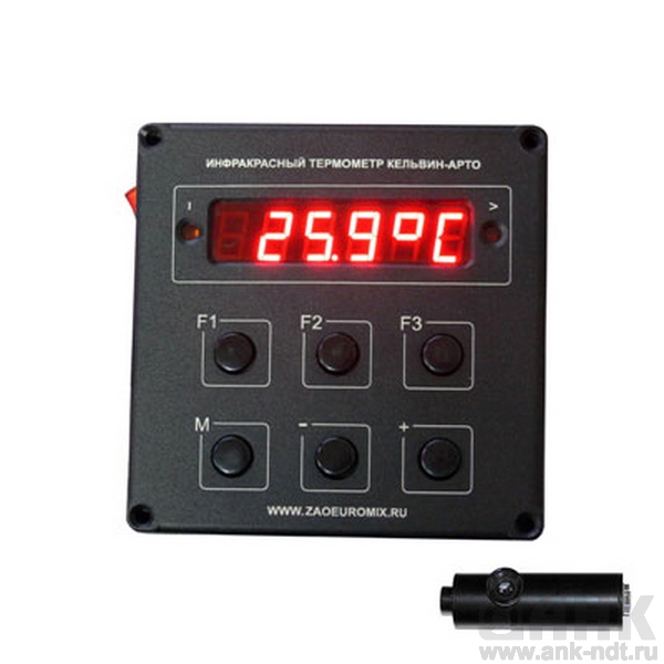 Пульт управления термометром может быть удалён от датчика на значительное расстояние. Он также выполнен в прочном металлическом корпусе, снабжен удобным индикатором и обеспечивает все необходимые для контроля технологического процесса режимы работы: ввод излучательной способности измеряемого материала, индикацию текущей и максимальной температуры, контроль достижения установленного порогового значения температуры с помощью индикатора и группы контактов реле.