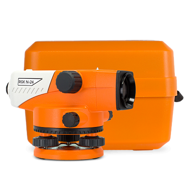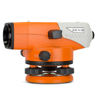 Стандартная комплектация: оптический нивелир RGK N-24, нитяной отвес, юстировочный набор, руководство по эксплуатации, транспортировочный кейс.